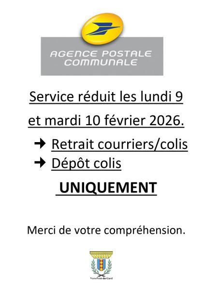 Agence postale communale – Service réduit les 9 et 10 février 2026
